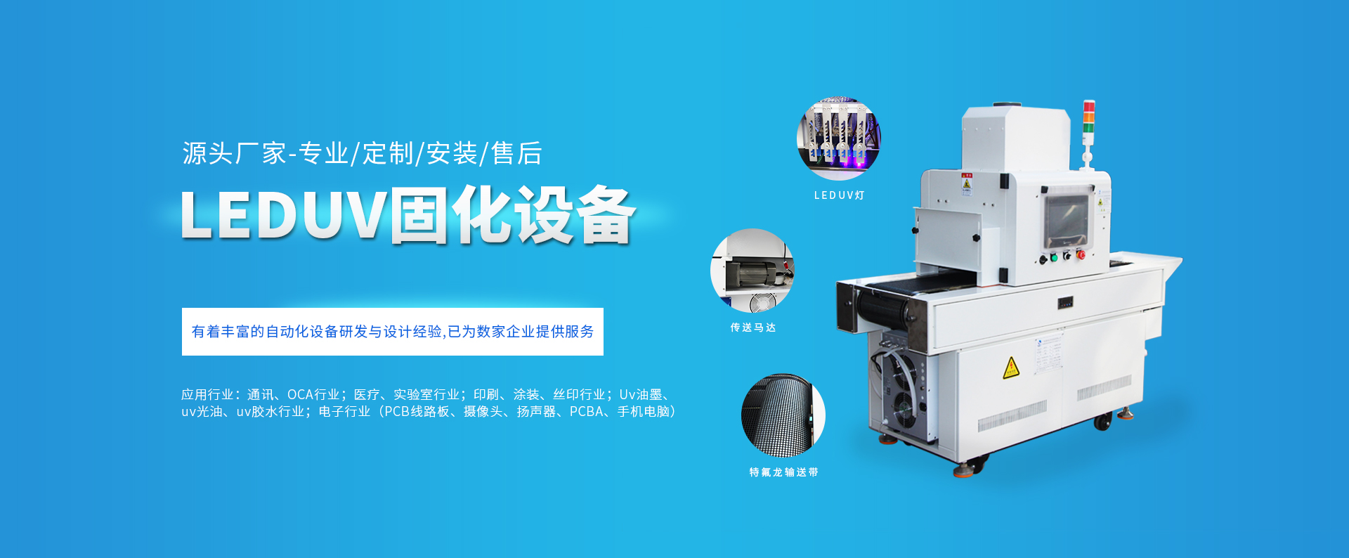 公司產品廣泛應用于:塑膠五金涂裝、家具木器石材涂裝、印刷、噴繪上光、絲印移印、PCB、涂布等行業,廣泛適用于各種:UV光油、UV油墨、UV油漆、UV膠水等多種類UV固化